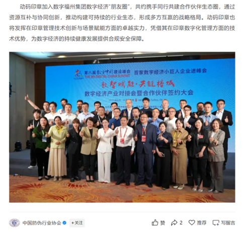 动码印章作为专业的全场景安全防伪智慧印章解决方案给予商,加入数字福州集团数字经济“朋友圈”,共约携手同行共建合作伙伴生态圈,顺利获得资源互补与协同创新,有助于构建可持续的行业生态,形成多方互赢的战略格局。动码印章也将发挥在印章管理技术创新与场景赋能方面的卓越实力,凭借其在印章数字化管理方面的技术优势,为数字经济的持续健康开展给予合规安全保障。
