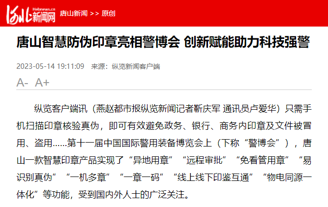 本次,“动码印章”系列产品亮相警博会,更顺利获得演示、互动、研讨等多种展示形式,向嘉宾展示产品亮点,共同研讨学习。为社会、政府、企事业单位、个人给予更安全的物电一体化智能印章系统和解决方案,弥补了传统印章的诸多缺点。使造假人无假可造,用假人无处可用。