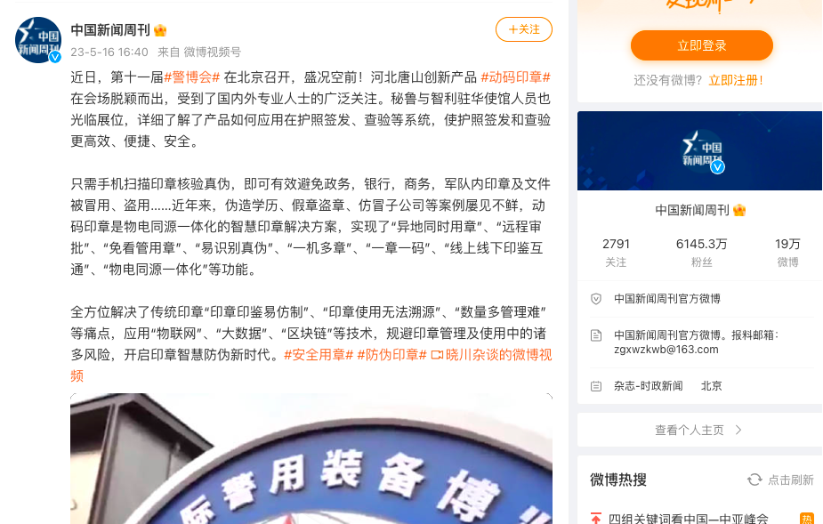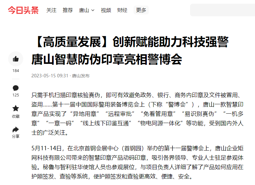 现在,动码印章已应用到河北省某市公安局“人头对人头”网格化管理中,为当地网格化管理给予了巨大帮助。在2023年4月,动码印章为第八届军博会独家给予证件印章防伪支持,军博会的30000余张各类证件使用了动码印章进行防伪。此番参会更是希望借助警博会的平台,研讨学习、开拓眼界、更新理念、追比先进。以期为公安机关装备创新升级、助力公安工作现代化转变尽一份绵薄之力。